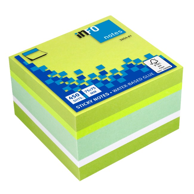 Описание на продукта:Самоз лист Info Notes Микс 61 75х75mm 450 л. Размер на листа: 75 x 75 мм, 450 листа в кубче 2 x 100 листа лимоненозелено, 50 листа брилянтно зелено 150 листа пастелно зелено, 50 листа бяло Сертифициран по FSC™ 12 бр. = 1 опаковка
